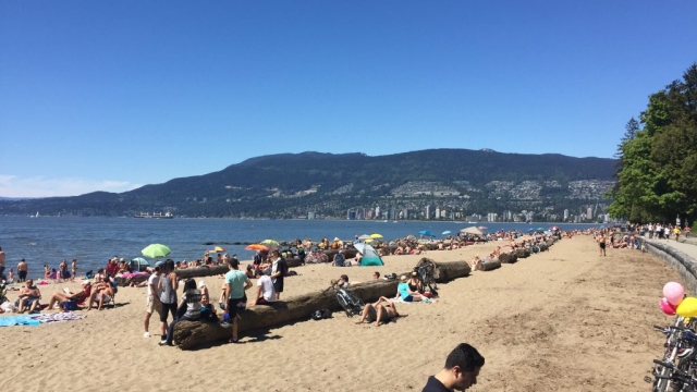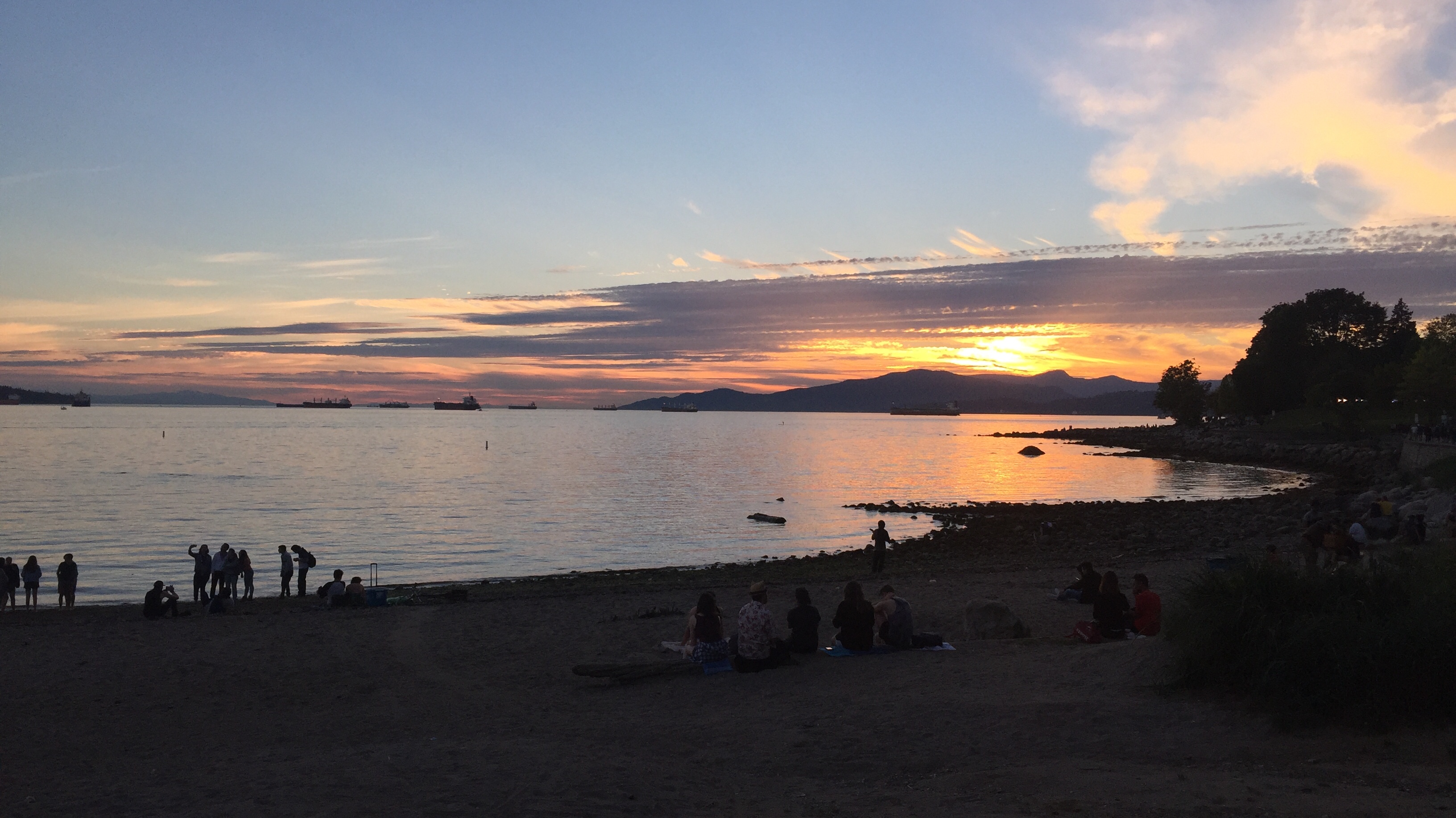 Abends ging es zum Sonnenuntergangs-Gucken an den English Bay Beach. Man sieht dann die Sinne hinter den Bergen untergehen, mit schönen Farben und Spiegelungen auf dem Wasser. Die romantische Stimmung hält sich aber in Grenzen, da man dort alles andere als alleine ist.