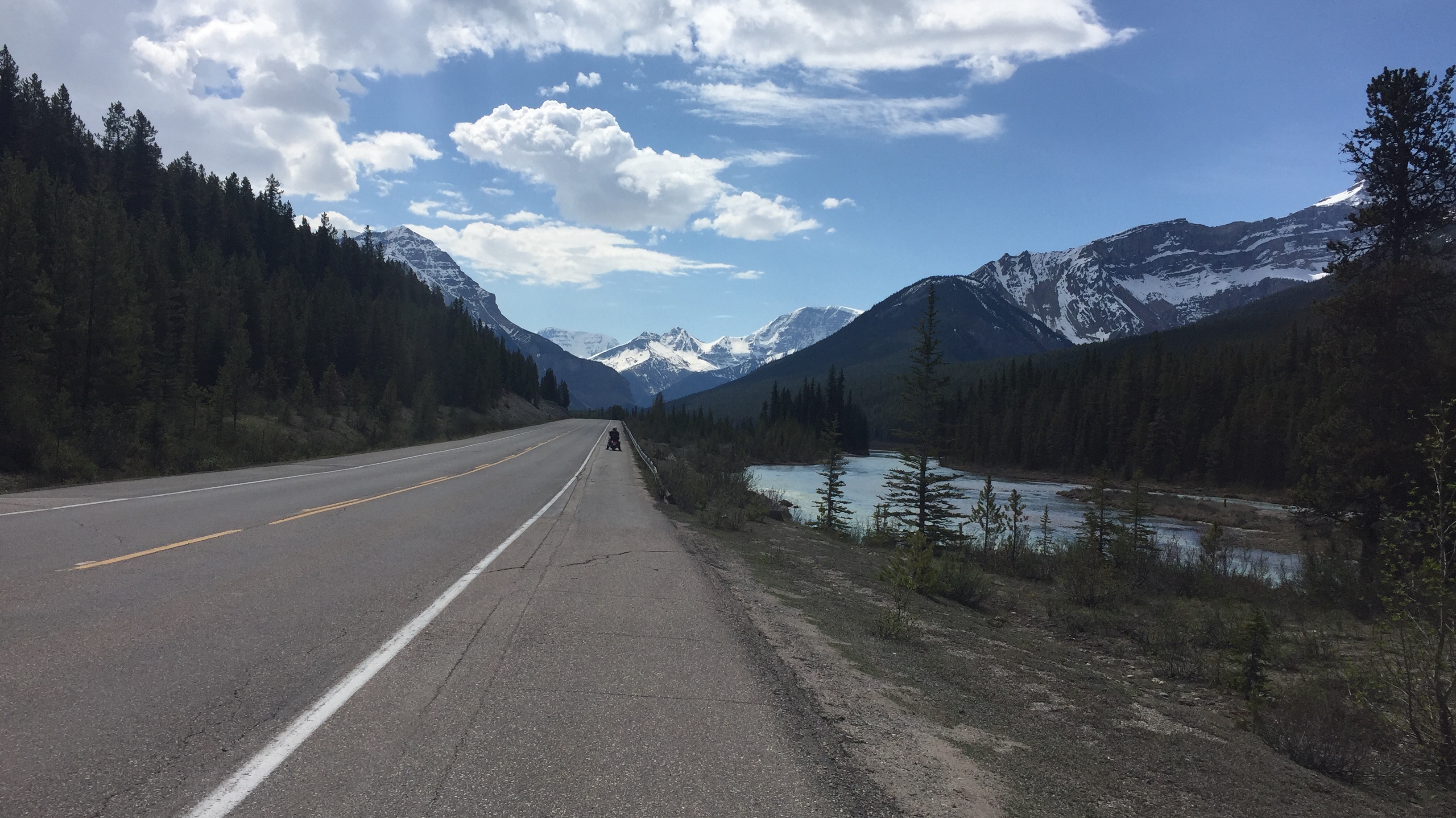 [sgpx gpx=“/wp-content/uploads/gpx/Etappe 4.gpx“][:en]Soviele atemberaubende Aussichten findet man wohl nur selten! Diese 320 km sind ein absolutes Highlight, und dass bei strahlendem Sonnenschein auf dem Motorrad genießen zu dürfen ist einfach traumhaft. Die Landschaft wirkt ganz anders auf einen ein und ich finde es immer wieder faszinierend, welche Kleinigkeiten man auf dem Motorrad alles mitbekommt: Kurze Temperaturschwankungen, wenn man an einem Bach vorbei fährt oder wenn oben auf dem Berg etwas Schnee liegt, und dann auf ein paar Metern ein kühler Wind kommt. Oder die Gerüche von Tannenwäldern, frischem Gras oder irgendwelchen Bergziegen, die am Straßenrand stehen 🙂Aber zurück zum Thema: Der Icefields Parkway ist ein Teilstück des Highway 93 und führt von Jasper nach Lake Louise. Wir hatten eine Unterkunft in Banff gebucht, wohin dann der TCH (Trans-Canada Highway) von Lake Louise weiter führt. Man kann für die ganze Strecke sicher auch zwei oder drei Tage verwenden, allerdings geht das dann nur mit Camping, da es zwischen Jasper und Lake Louise keine Unterkünfte gibt. Daher hatten wir uns schweren Herzens entschieden, z.B. die Sthabasca Falls und Sunwapta Falls auszulassen und statt dessen nur an den normalen Aussichtspunkten direkt an der Straße anzuhalten.