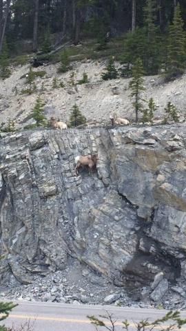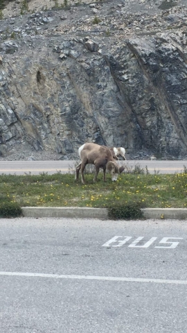 An einem von diesen Aussichtspunkten war gleich ein Riesen-Auflauf und dann ist hier immer gleich klar: da müssen irgendwo Tiere in der Nähe sein. Und tatsächlich: ein Dickhornschaf kletterte in der quasi senkrechten Felswand über der Straße rum, zwei guckten sich das Spektakel von oben an und einer fraß auf dem Parkplatz genüßlich den Löwenzahn ab.