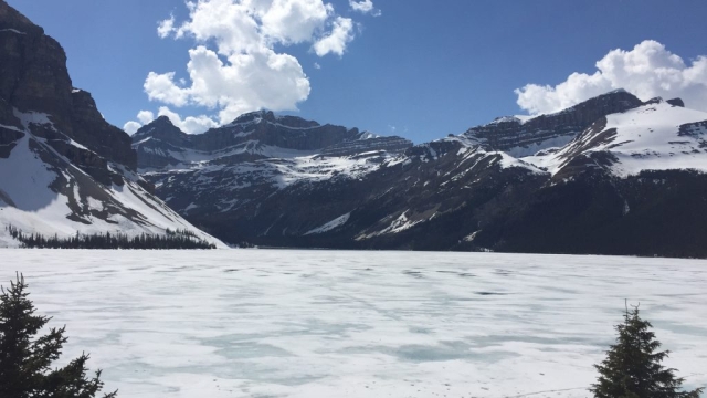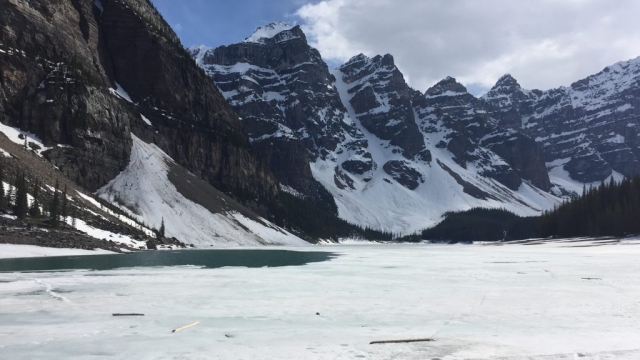 Die Strecke hat kurz hinter dem Icefields Center ihren höchsten Punkt bei knapp über 2000 m, danach geht es zunächst leicht abwärts, um dann beim Bow Summit wieder auf fast 2100 m anzusteigen. Hier gibt es einen weiteren Aussichtspunkt, der in den Reiseführern hochgelobt wird: den kurzen Aufstieg zum Bow Summit Lookout, von dem man einen tollen Blick über den Peyto Lake hat. Allerdings war der kurze Aufstieg leider noch verschneit, so dass wir mit unserem Motorrad-Schuhwerk nach einigen Metern die Segel streichen mussten.Auch die Seen waren hier noch zugefroren, was wir auch bei unserem nächsten Stopp, dem Moraine Lake erkennen mussten. Das bekannte Panorama mit dem magisch blauen See hatte bei geschlossener Schneedecke keinen so hohen Wiedererkennungswert. Die Lage ist natürlich trotzdem einmalig, von 10 Gipfeln umschlossen.