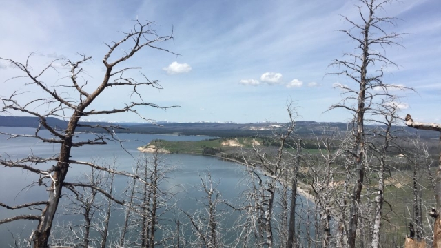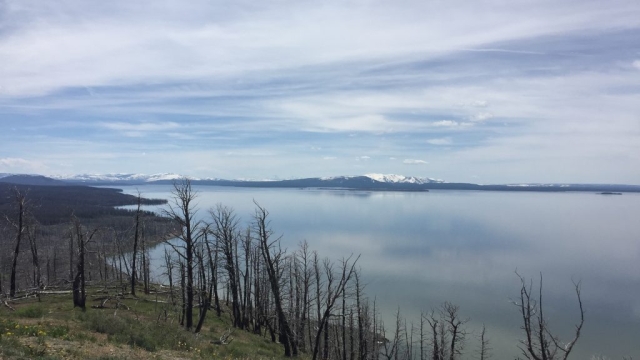 Im Park fuhren wir zunächst über den Sylvan Pass (knapp 2600 m). Relativ kalt da oben, die Seen dort noch teilweise gefroren. Von dort geht es dann wieder runter, in Richtung Yellowstone Lake. Vom Lake Butte Overlook hat man eine schöne Aussicht über den See.